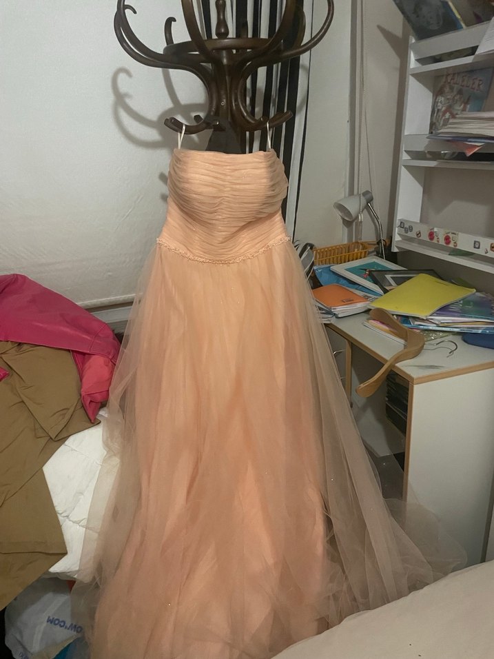 Yavruağzı renkte, straplez ve drapeli uzun nişan elbisesi. Vintage bohem tarzda, fit kesim ve ince askılı detaylara sahip.