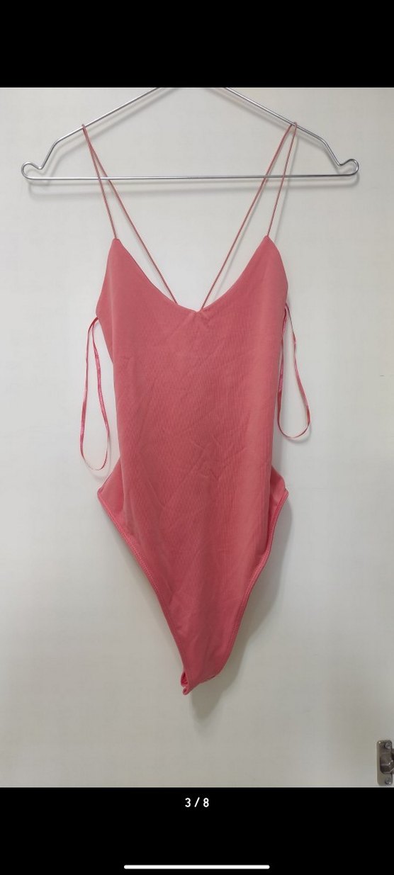 Hiç giyilmedi. İnce askılı, pastel pembe renkte, vücuda oturan kadın mayo. Desensiz, midi boyda, günlük kullanım için ideal, cesur athleisure streetwear tarzında.