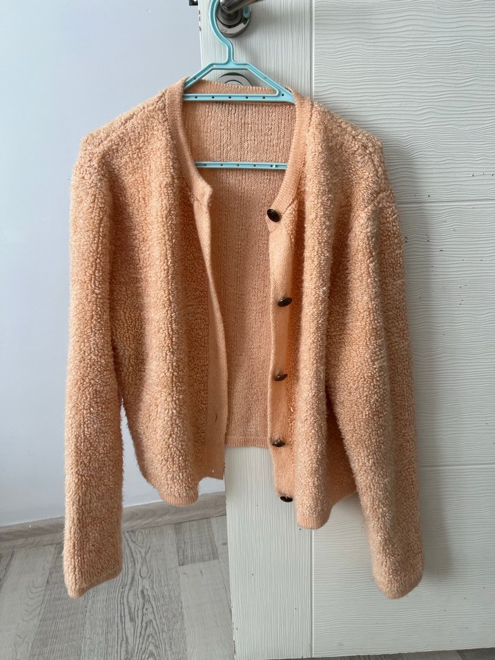 Yavruağzı renkli, örgü dokulu, notched lapel yakalı ve uzun kollu. Rahat kesimli, midi boyda, gündelik kullanıma uygun normcore tarzda hırka.