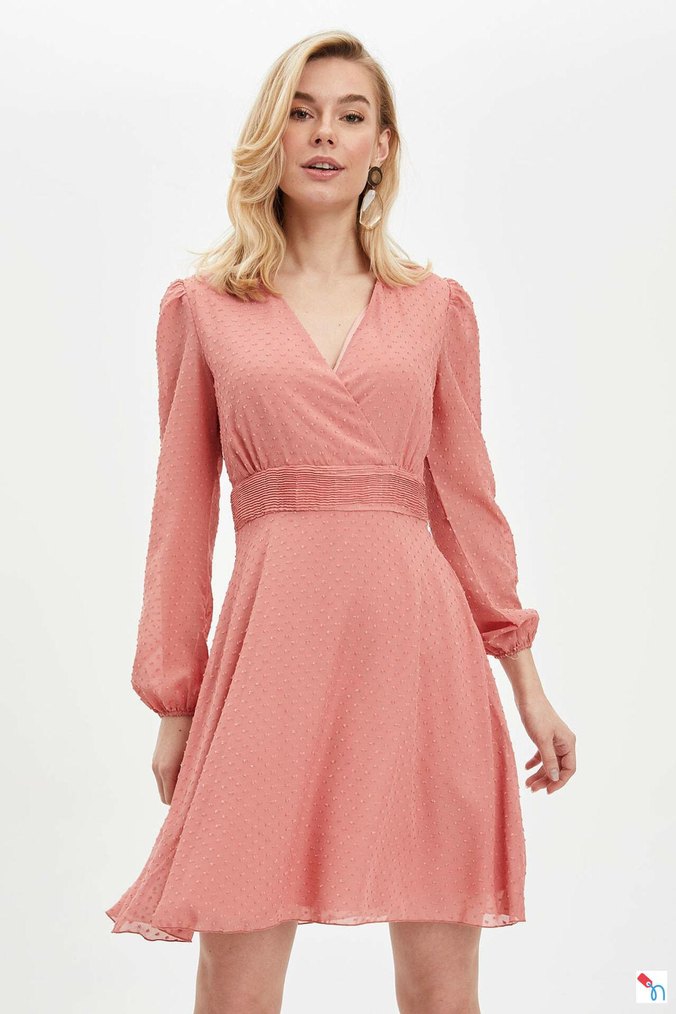 Yavruağzı pilili midi elbise, V yaka ve uzun kollu. Pastel puantiyeli, bol kesim ve modern klasik tarzda, romantik buluşmalar için uygun.