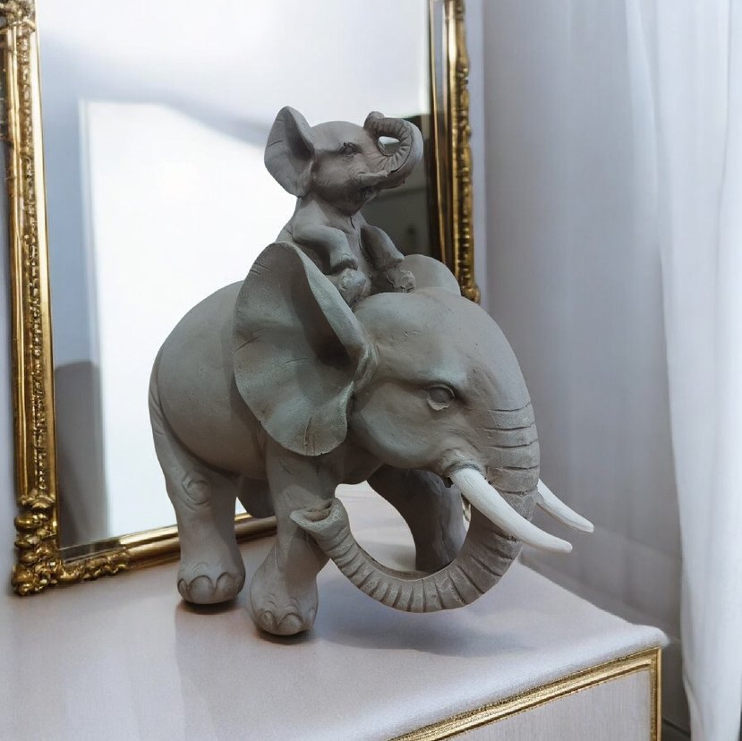 Gri renkte büyük bir filin sırtında küçük bir fil bulunan detaylı heykel. Fil figürlerinin hortumları ve dişleri özenle işlenmiştir. 26*24 cm . polyester üründen üretilmiştir ve tasarımdır. Marka temsilidir. #filbiblo #filheykel