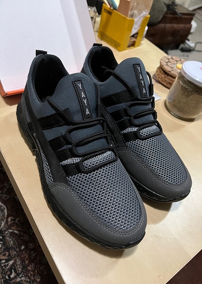 Kutusunda giyilmemiş açılmamış 41 numara standart kalıp ayakkabı. İç boy 26 cm. Rengi gri haki siyah karışımı. Günlük Sneakır