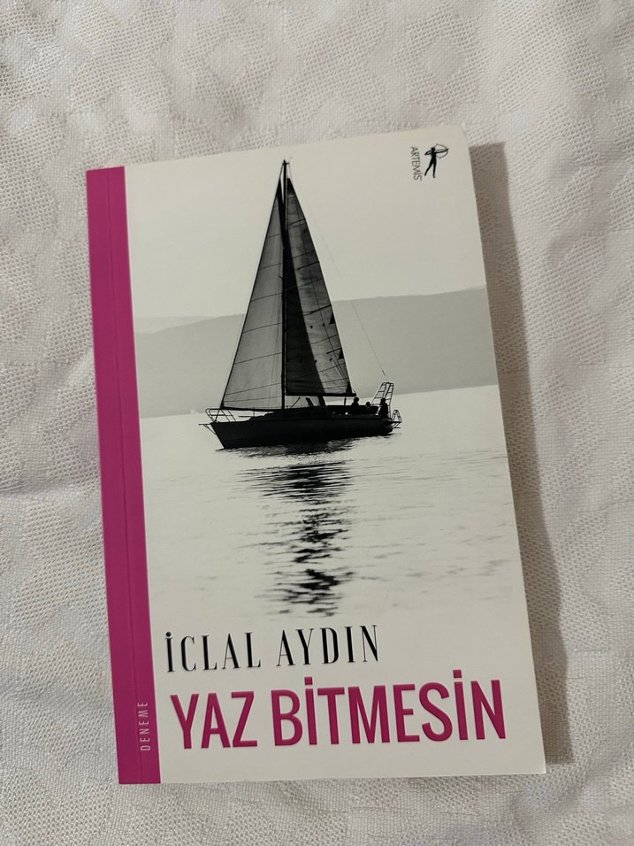 İclal Aydın'ın "Yaz Bitmesin" romanı, sakin sularda yelkenli bir tekne görseliyle huzurlu bir atmosfer sunuyor.