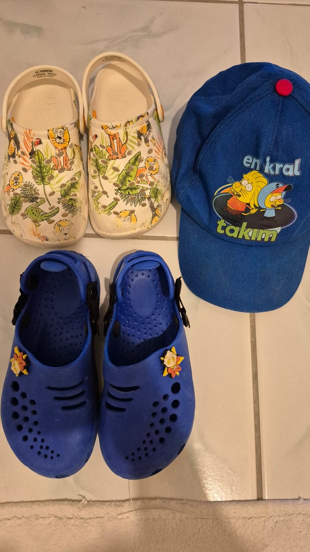 Mavi terlik 29-30 numara Beyaz terlik 31 numara Şapka orijinal Kral Şakir marka. Deformasyon yoktur. Bu fiyata kaçmaz
