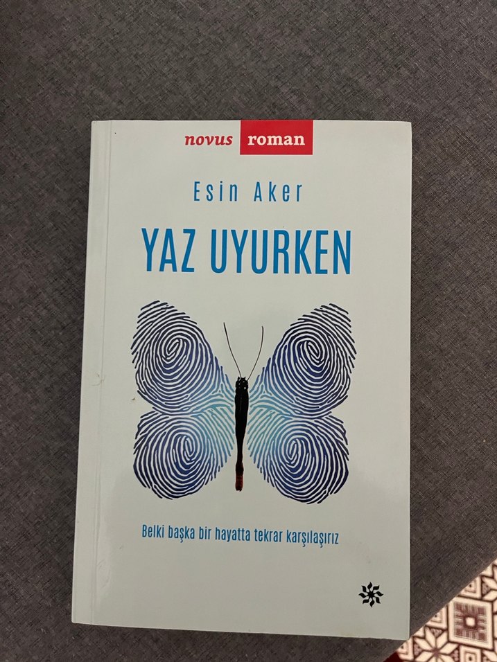Esin Aker'in Yaz Uyurken adlı romanı, hayat ve kader temalarını işliyor. Kapakta benzersiz kelebek parmak izi tasarımı bulunuyor.