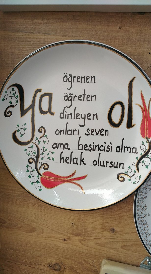 Beyaz tabak üzerinde yazılı desen ve çiçek süslemeleri bulunan, geleneksel tarzda ve açık renk tonunda bir tabak. ️