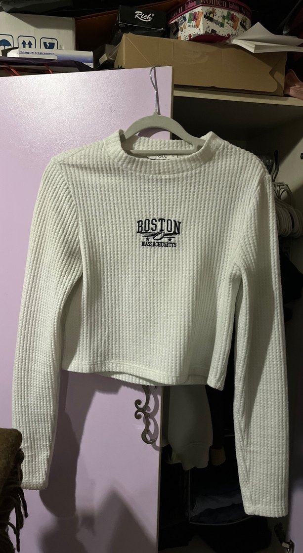 Beyaz, örgü dokulu, uzun kollu ve düz kesim kadın tişörtü. Lcw markası L beden.