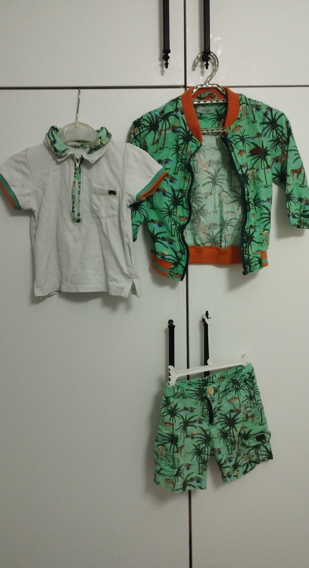 Kısa kollu beyaz gömlek, yüksek yaka, çizgili detaylar; yeşil palmiye desenli fermuarlı ceket ve şorttan oluşan yumuşak dokulu baby boy takım.