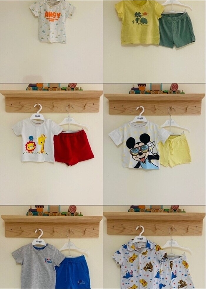 Toplu fiyatıdır Hepsi çok iyi durumda. Bedenleri muhtelif ancak hepsini 5. Aydan itibaren 8 aylık oğluma şimdiye kadar giydirdim. Tekli olarakta satış yapabilirim Son resimdeki pijamadır. İlk 2 resim Markası hello baby Kırmızı takım fisher price Sarı takım defacto sondaki Pijama LCW
