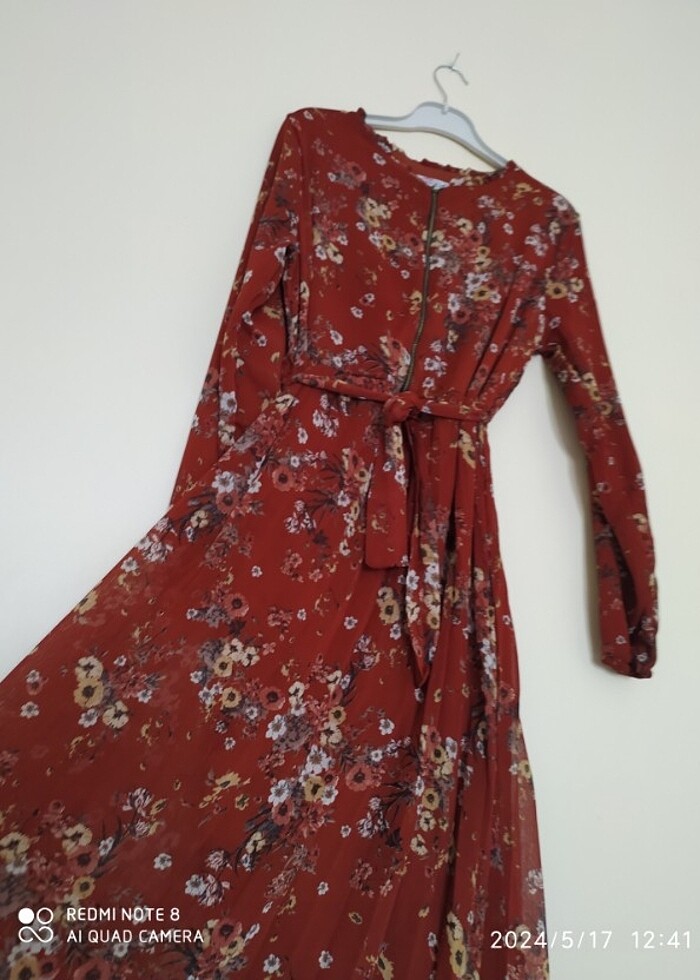 Çiçekli şifon elbise kemerli önü fermuar eteği piliseli 38 40 beden