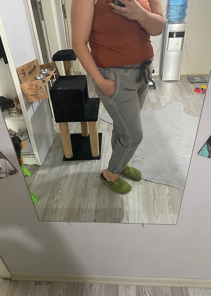 Çok rahat ve incecik bir pantolon Beli arkadan lastikli, kemeri dahil Ayak kısımlarıda lastikli Yurtdışı ürünüdür 1-2 defa giyinildi Beli 51 cm, lastikli olduğu için dahada genişliyor 100% pamuk