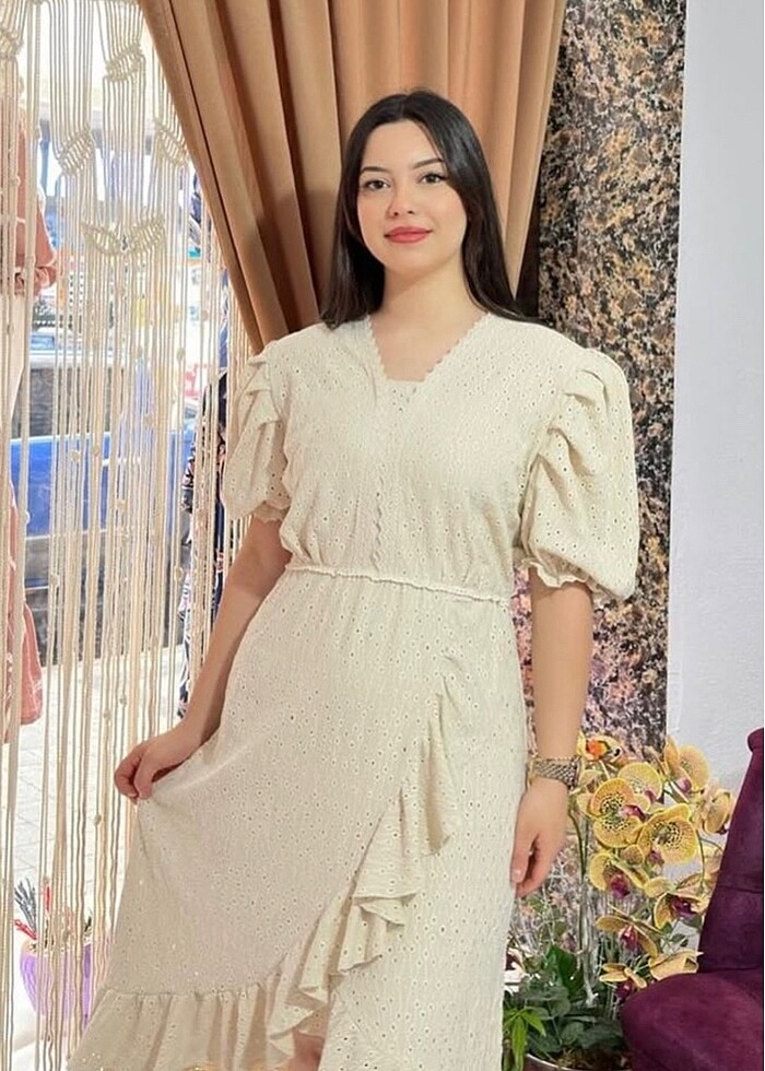 Yazlık elbise 40.42.44 beden uyumlu mankenimiz 38 beden esnek bir kumaştır özel dikim krem rengi