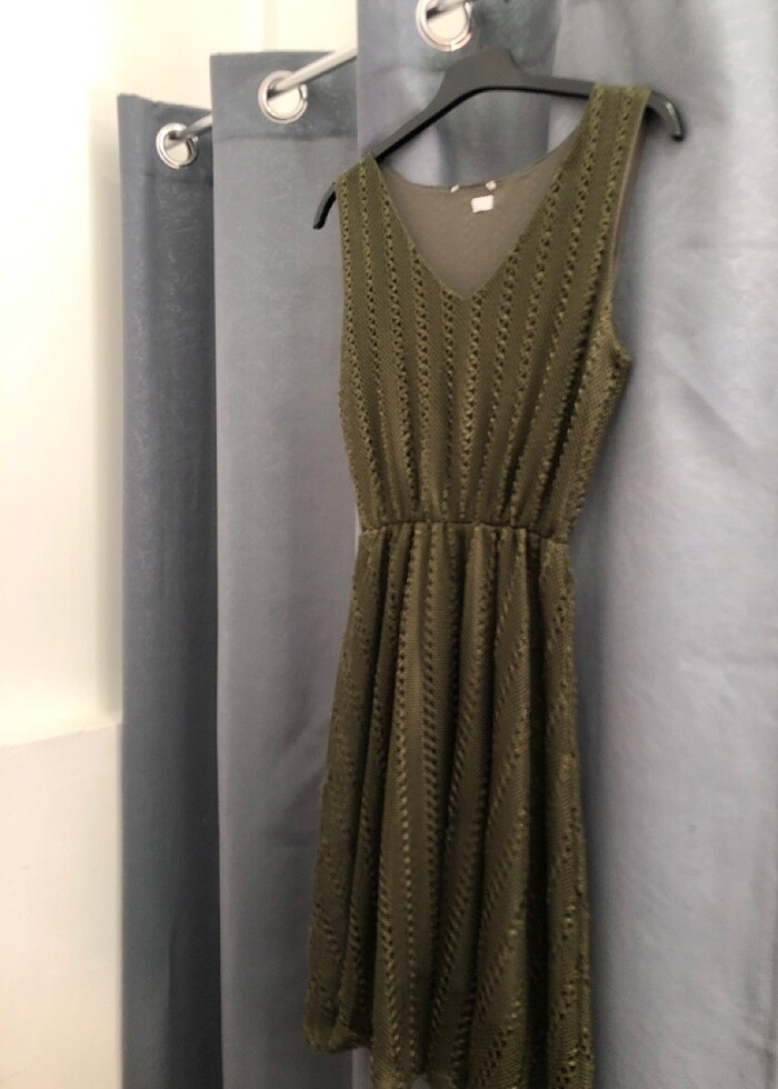 İnce file kumaştan astarlı, beli lastikli, önden V yaka , diz boyu , kolsuz elbise