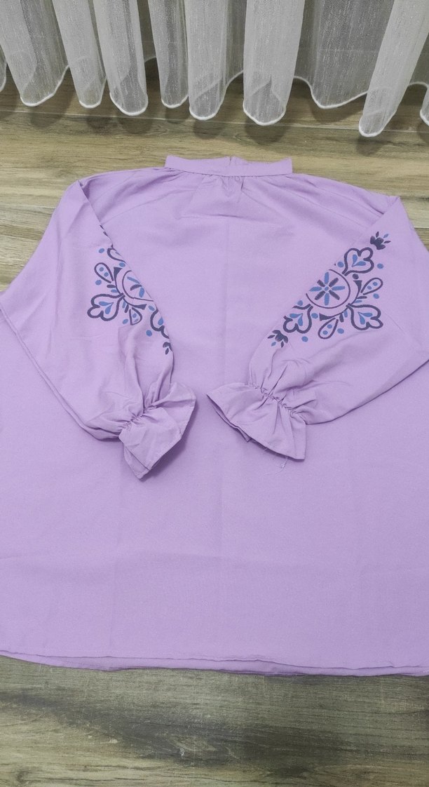 Mor pastel tonlarında, bohem tarzda, uzun kollu, nakışlı ve fırfırlı manşet detaylı bol kesim kız bluzu.