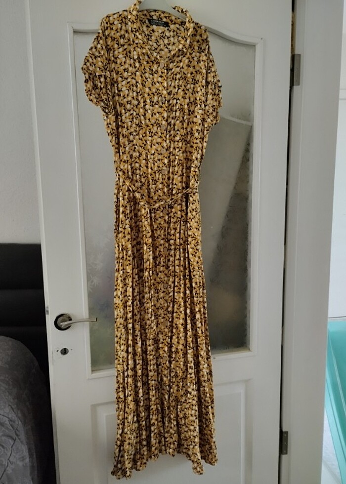 Bir kere giyilmistir yukarıdan aşağıya kadar düğmelidir viskon kumaştır cep bölümü vardır