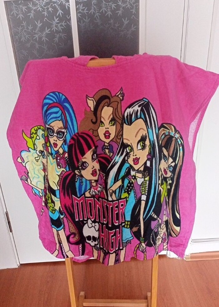 Montser High desenli kız çocuk panço hiç giyilmedi sıfır ürün. 13-16 yaş arasıdır. Kapüşonludur. Hiçbir defosu ya da leke bulunmuyor. Boyu 63cm, eni 65cm dir. Hem önünde hem arasında desenler bulunuyor. Rengi çok canlı, soluk değil. İki yanı açıktır. İNDİRİM YAPILIR.