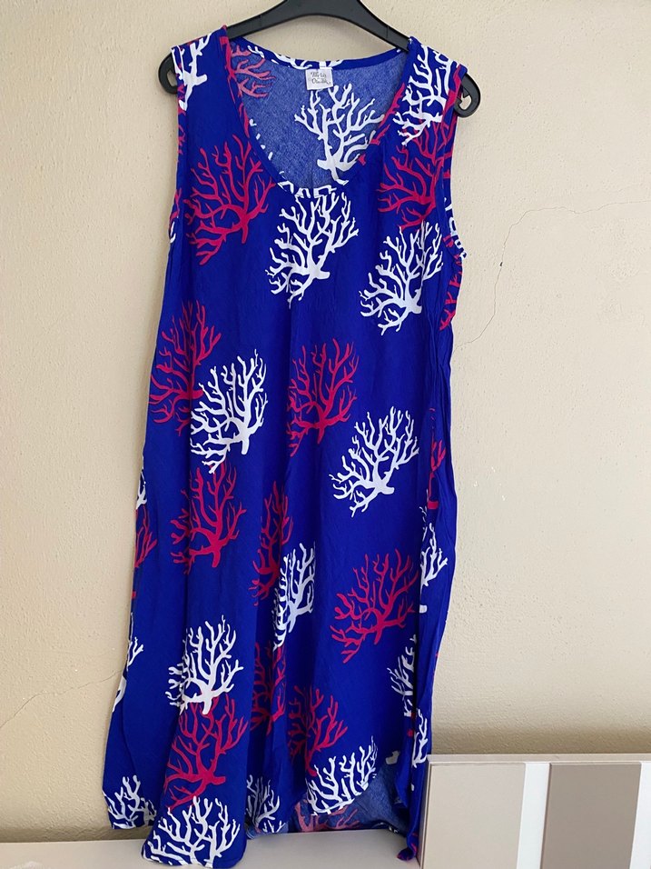 Kolsuz, renkli bağlama desenli, V yakalı, bol kesim elbise