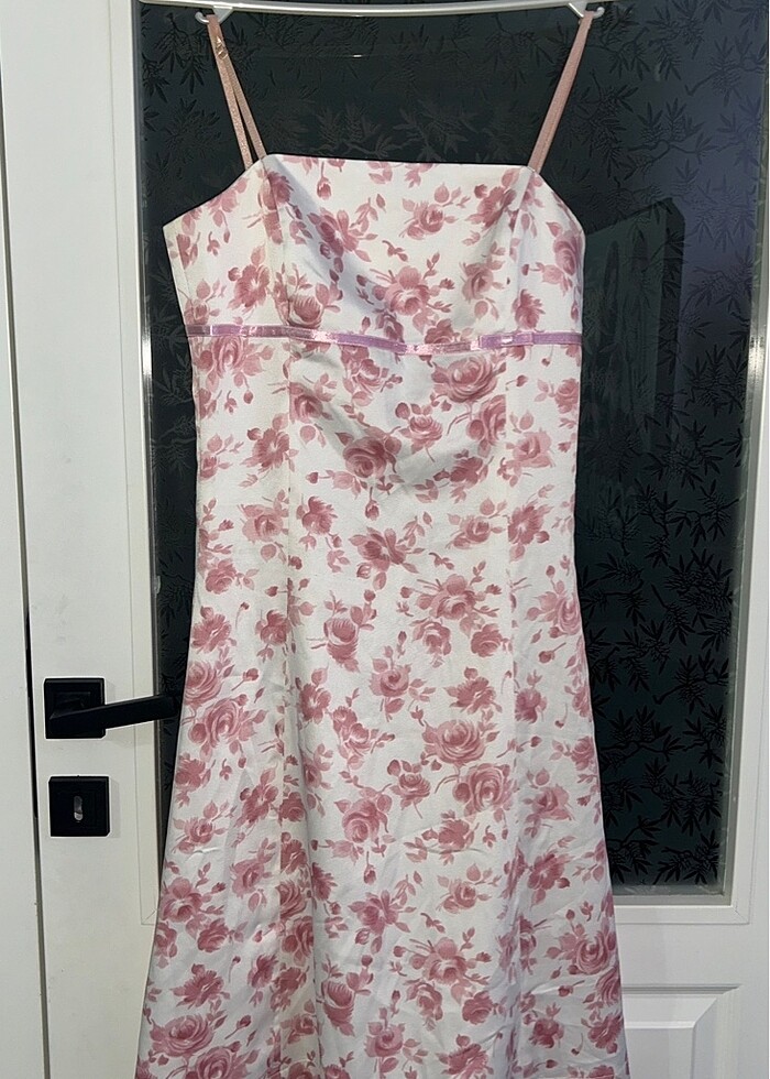 Esnek saten kumaş beyaz iç astarlı ayarlanabilir askılı arka gizli fermuarlı hafif A kesim my emmy marka S beden günlük mezuniyet abiye elbise