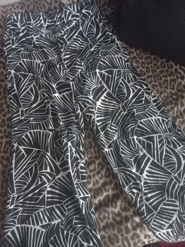 Kadınlar için gri zebra desenli, bol kesim ve pileli uzun pantolon. Yumuşak sentetik kumaştan, sokak ve bohem tarzlara uygun.