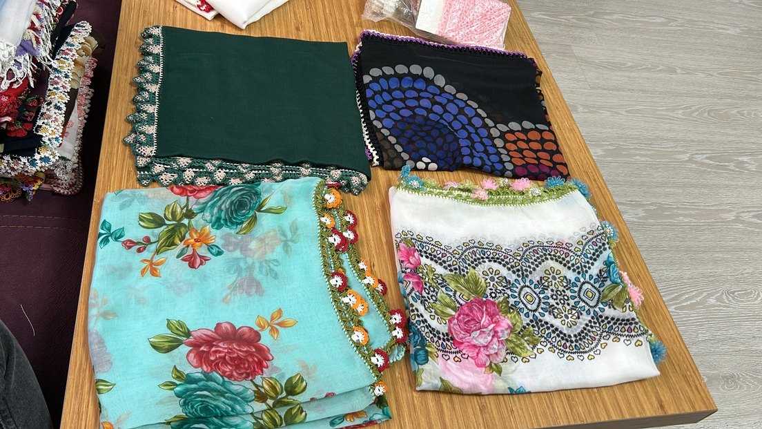 Renkli dantel detaylı, yumuşak kumaştan bohem tarzda kadın fularları. Çiçek ve geometrik desenler içerir, retro ve hippie görünüm sağlar.
