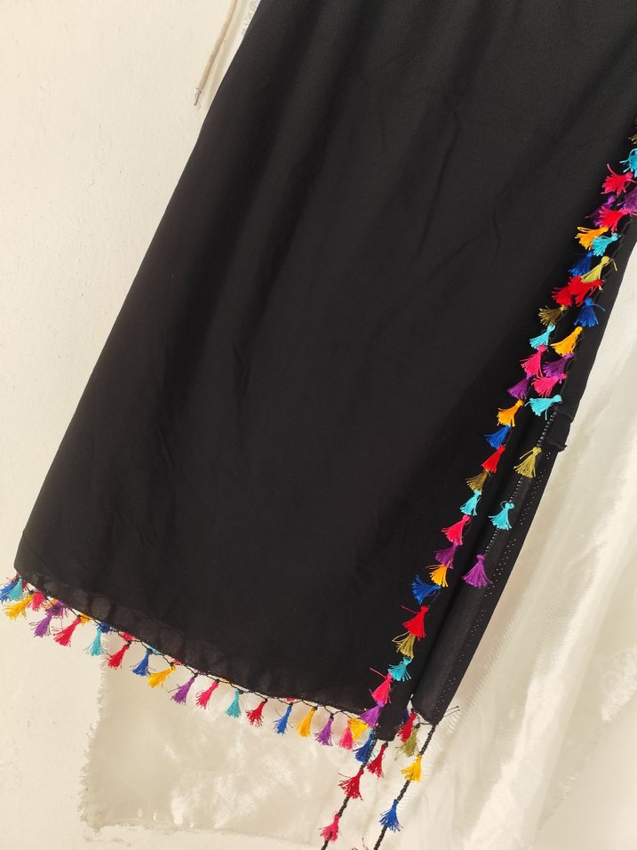 Kenarları çok renkli püsküllerle süslenmiş koyu renkli bir tekstil şal. Bohem, retro ve hippie tarzına uygun.