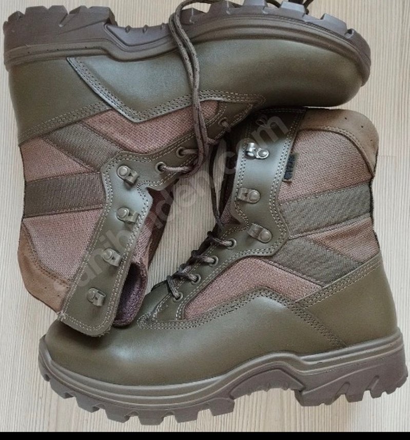 Haki deri, kamuflaj desenli, kemer detaylı erkek bot. Minimalist tarzda, günlük kullanıma uygun. 42 numara