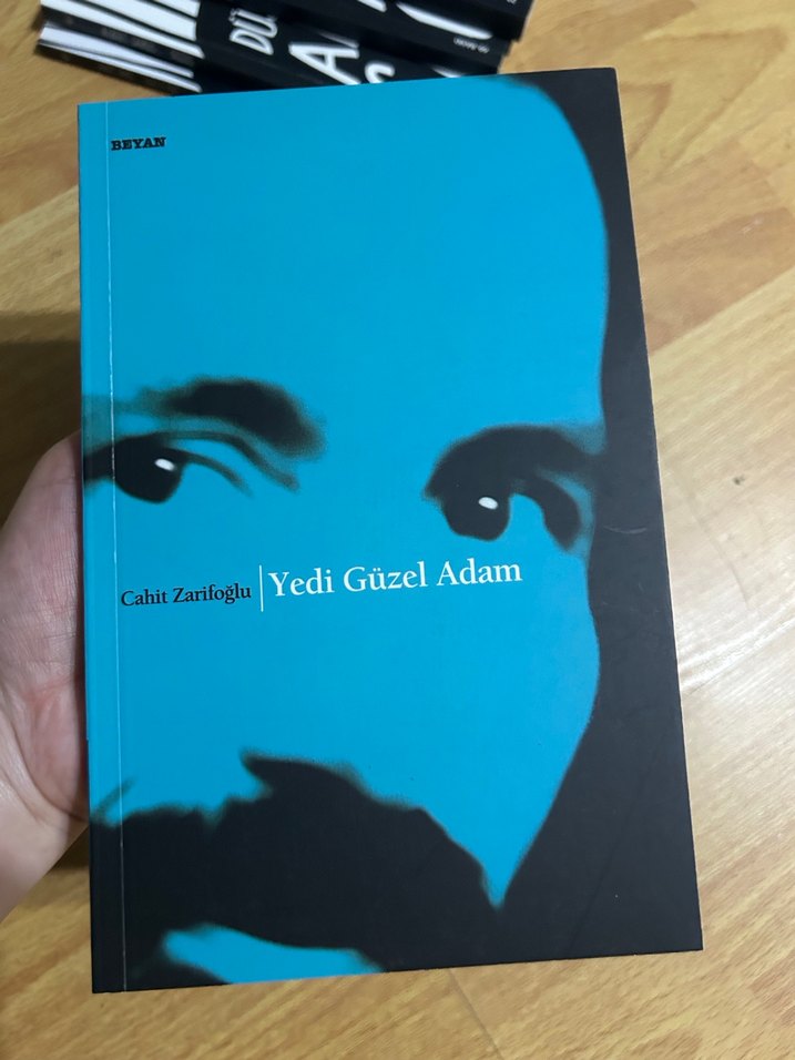 Cahit Zarifoğlu'nun "Yedi Güzel Adam" romanı, mavi ve siyah kapakta bir adamın yüzünün yakın çekimini içerir.