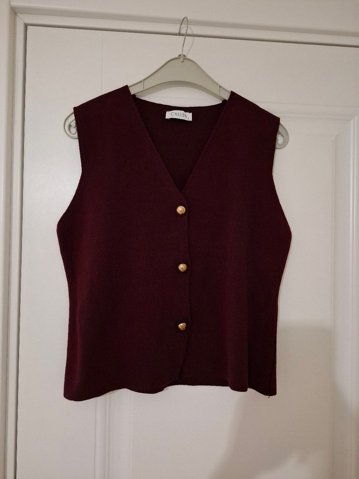 Bordo, düğmeli, V yakalı, yün kumaştan, normal uzunlukta ve bol kesim midi kadın yelek. Minimalist ve desensiz tarzıyla gündelik kullanıma uygundur. İnce triko kumaşı var. Hiç kullanmadım aldığım gibi duruyor.