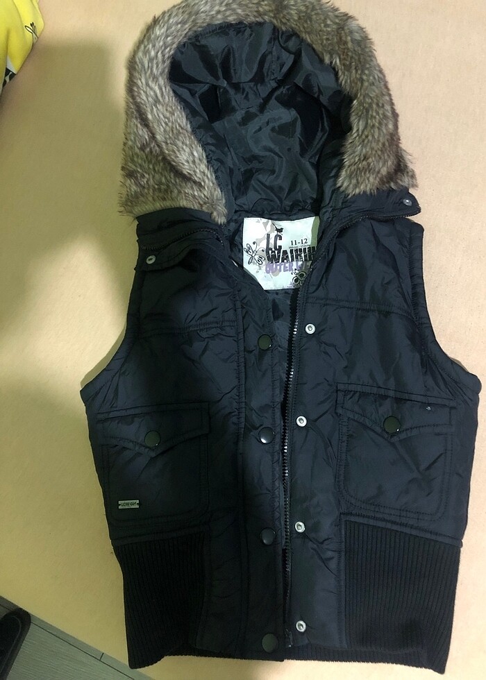 Belden kapüşonlu 11-12 yaş siyah yelek.Cebini kenarında küçücük deformesi var resimlerde var.boy 46 cm,bel 41 cm