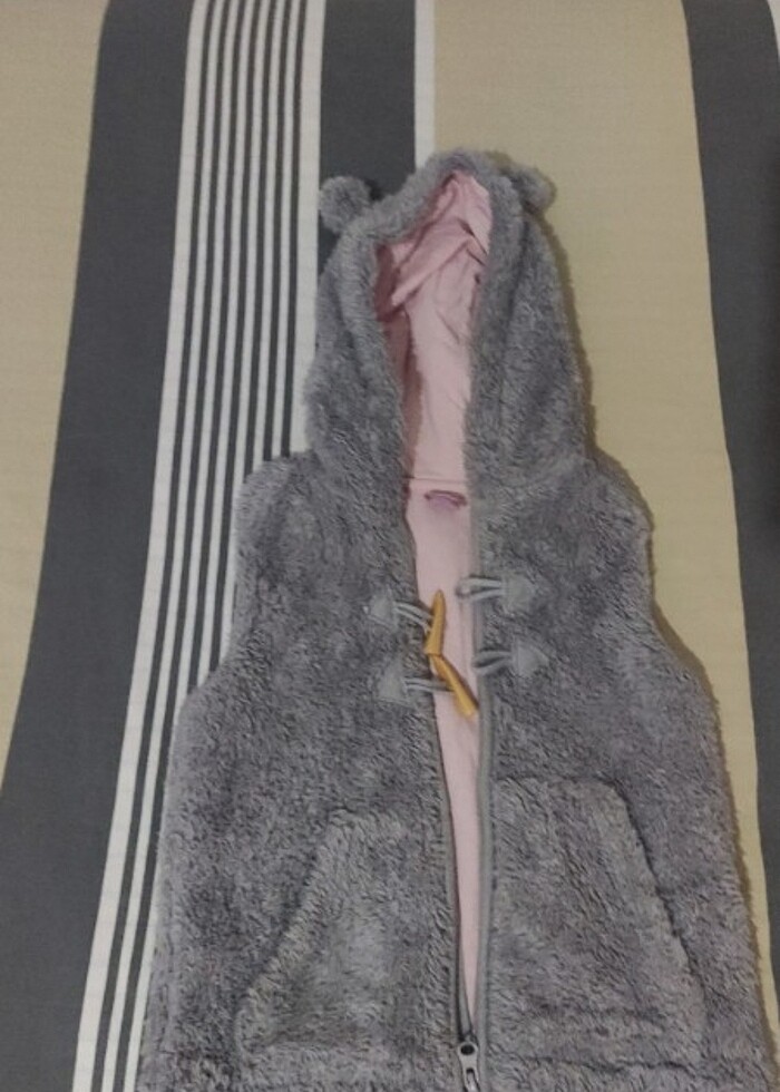 Peluş yelek,sapkasinda kulakları var,çok pofuduk,1,5-2 yas