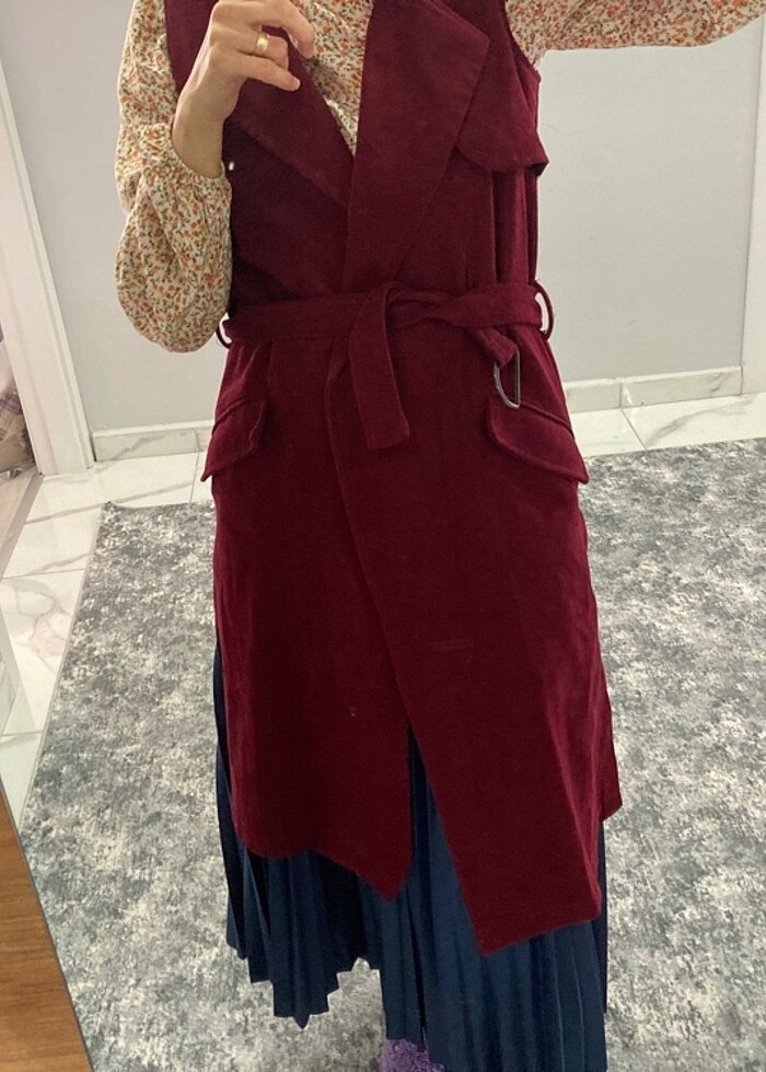 Kumaşı mevsimlik düğmesiz kuşaklı yelek. Marka temsili. Kadifedir sıkıntısı yoktur