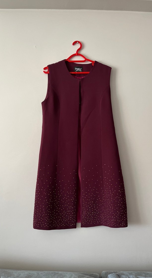 Kollarsız, düğmeli, bordo uzun elbise. Parlak yüzeyli ve etek kısmında ince süslemeler bulunur. Normal kesim ve uzun boy. Hiç bir kusuru yoktur.