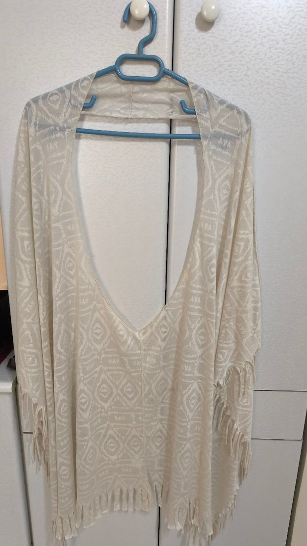 Yelek, pareo deniyor sanırım. Arka kısmı açık. Minicik lekesi var. Fotoda ekli. Aslında hiç kullanılmadı. Ama dolapta lekelenmiş.