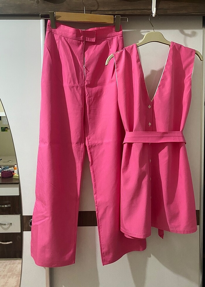 2 kez giyindim. Kırışmayan bir keten kumaşı var. Düğmeli kısım sırt detayı. 36-38 de uyumlu olur diye düşünüyorum. Pantolonun fermuarı bozuk başka sıkıntısı yok