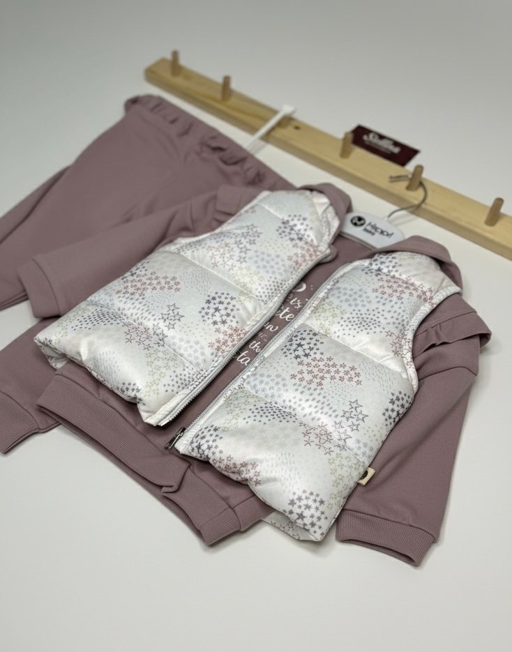 Minik yıldızının kış gardırobunu hem sıcacık hem de en şık parçayla tamamlamak ister misin?Sevimli yıldız deseni ve en trend gül kurusu renginin uyumuyla tasarlanan bu 3'lü Eşofman Takımı, bebeğinizin tüm gün konforlu ve enerjik hissetmesini sağlayacak.; Spor şıklığı, hareket özgürlüğüyle birleştirdik!Ürünümüzü Neden Seveceksin?• 3 Parça Pratik Kombin: Pamuklu eşofman altı, fırfırlı detaylara sahip sweatshirt ve desenli kapitone yelekten oluşan set ile tek tıkla eksiksiz bir görünüm.; • Kapitone Şişme Yelek: Soğuk havalara karşı ekstra koruma sağlar.; Hafif dolgusu sayesinde hareketleri kısıtlamaz, yıldız deseniyle şıklığı tamamlar.; • Yumuşak ve Konforlu Kumaş: Cilde nefes aldıran, pamuk ağırlıklı yumuşak dokusu sayesinde miniğinizin hassas cildine nazik davranır.; Oyun saatleri ve günlük kullanım için idealdir.; •• Mevsimlik Kullanım: İç mekanlarda yeleksiz, dış mekanlarda yelekli olarak rahatça kullanılabilir.