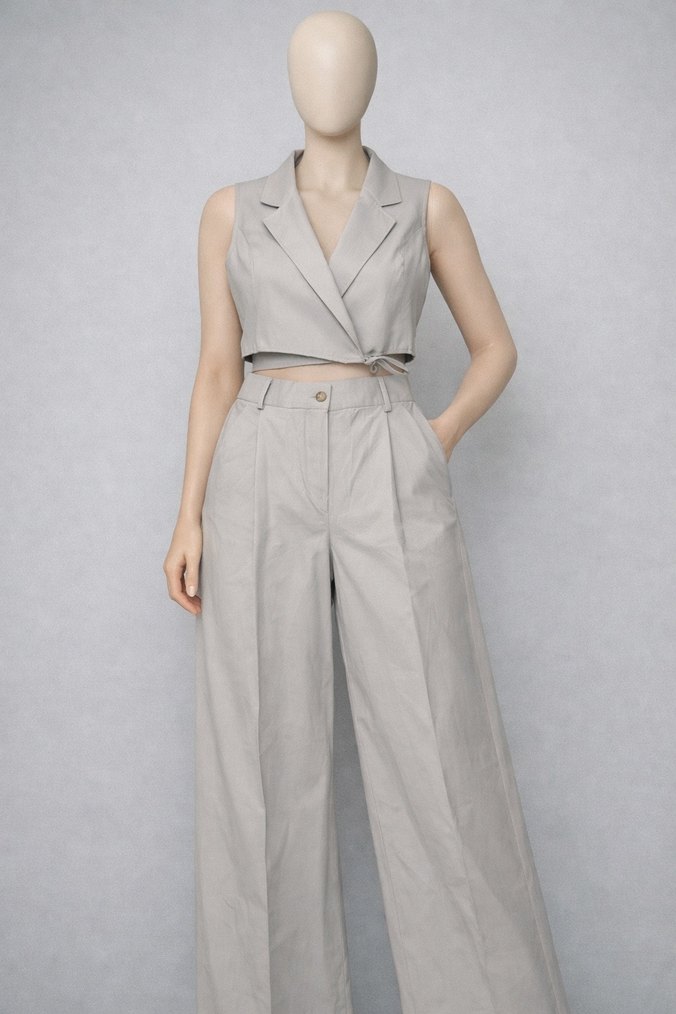 Kolsuz, belden bağlamalı, astarlı taş rengi, trençkot kumaşından kadın takımı, normal boy ve geniş paça pantolonla ofis şıklığı sunar. etiketi üzerinde hiç giyilmedi.