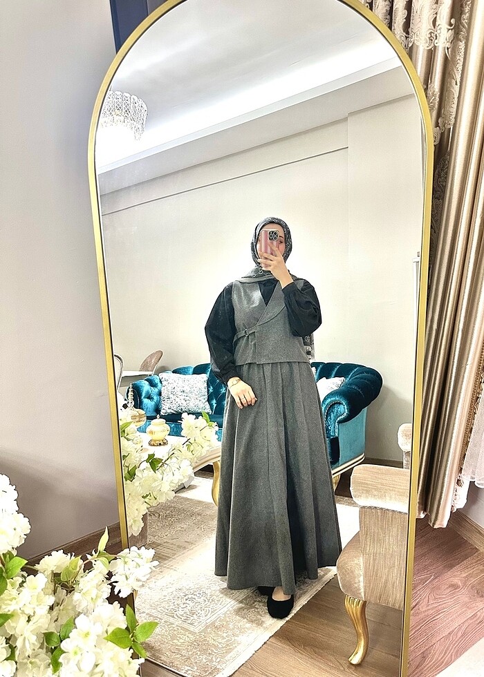 Yelek ve etekten oluşan ikili takım. Kışlık kumaştır. Etek boyu bileğime kadar tam boy. Sadece 1 kez çekim için giyildi. 36 38 beden uyumlu boyum 1.70 kilom 65