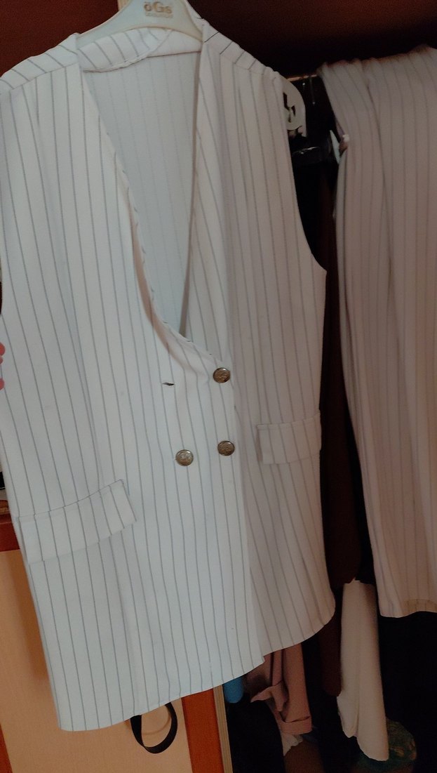 Düğmeli ön kısmı ve kolsuz tasarımıyla beyaz çizgili midi ceket, normal kesim ve ofis kullanımı için uygun
