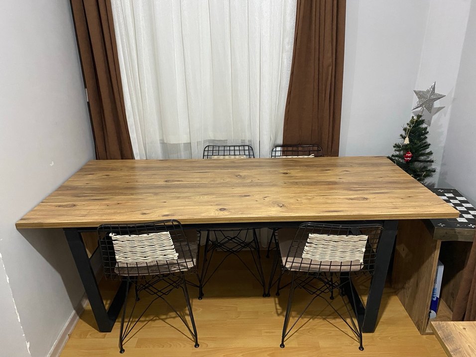 Ufak tefek boyatmaları var absorbe edilebilir. sıfır ayarında Doğal ahşap görünümlü yemek masası ve 4 adet sandalye. suntalam üründür. sandalyeler demirdir ip örgüsünü ben dizayn ettim. isteyen iplerini çıkartabilir. sandalyeler siyah deri tabandı. deri istemediğim için giydirmesini de ben yaptım. isteyen onu da sökebilir fakat derisi çok kullanışlı olmaz. Elden teslim esenyurt İstanbul ölçüleri 80x180 cm dir. ağır bir üründür.