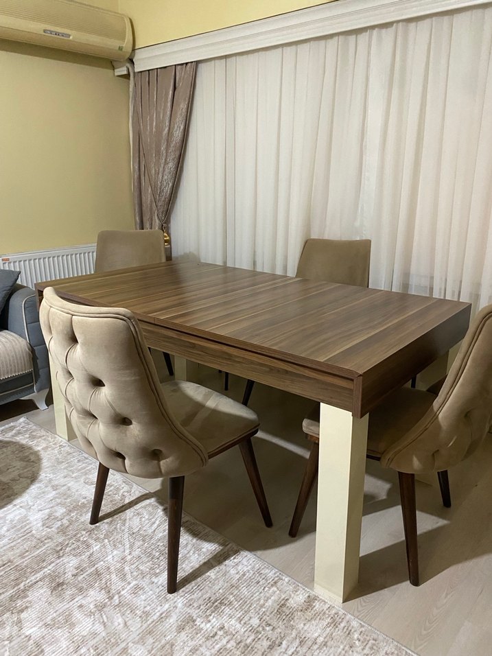 Yemek masası yanında gorseldeki 4 tane sandalye verilecektir masa ortasından açılıp büyütülebilir bi yerınde bı sıkıntı yok az kullanıldı masanın eni 90 cm uzunlugu 160 açıldığında 190-210cm arası uzunlugu oluyor istanbul içi fiyatta yardımcı olunur İstanbul içi satıştır kendim teslim edeceğim bi yerıne bişey olur mu diye suphenız olmasın