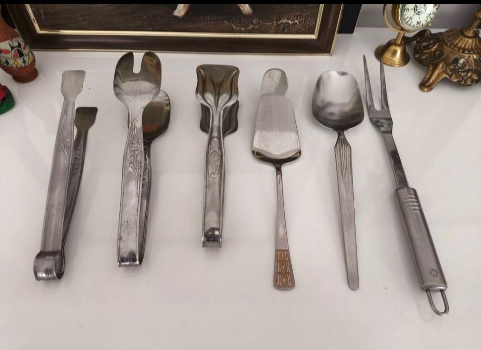 Yiyecek servisi için farklı şekillerde ve ince desenlere sahip dört parçalı gri metal çatal-kaşık seti. HEPSININ.TOPLAM FIYATIDIR.