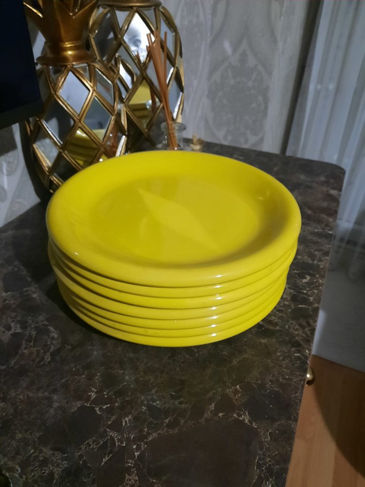 Toplam 7 tanesinin fiyatıdır. Büyük boy tabak. Canlı sarı renkte, yemek sunumuna uygun tabak seti. Düz yüzeyli ve parlak renklidir. ️