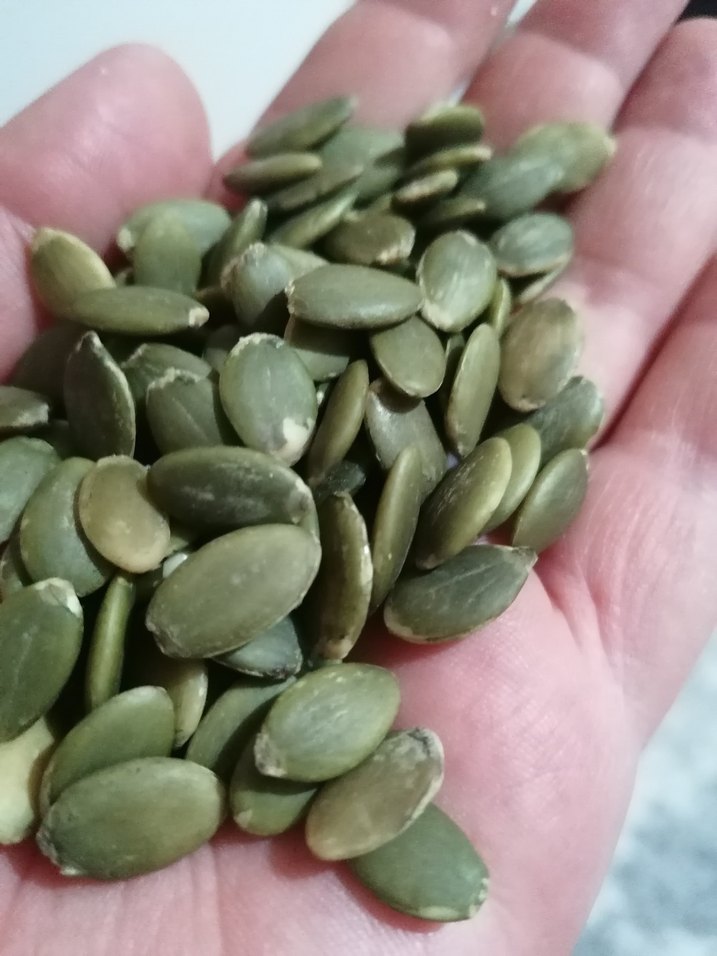 Elde tutulan yeşil kabak çekirdeği, doğal atıştırmalık veya malzeme olarak uygun.