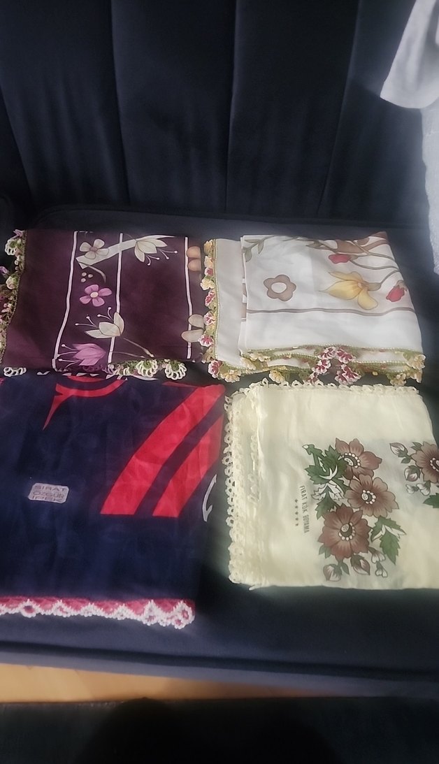 pamuklu yazma yemebi 4 adet fiyatıdır tekstil kumaştan yapılmış, dantel detaylı ve koyu renkli çiçek desenlerine sahip dört vintage kadın fular seti. Bohem ve retro tarzını yansıtır.