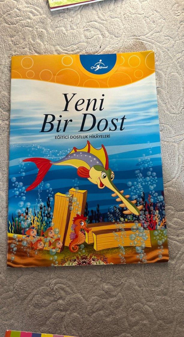 "Yeni Bir Dost" çocuk kitabı, eğitici dostluk hikayeleri ve renkli sualtı çizimleri içerir. Bazilari karalanmis. Bir tanesi de hafif yipranmis. Onun disinda temiz (6 kitap)