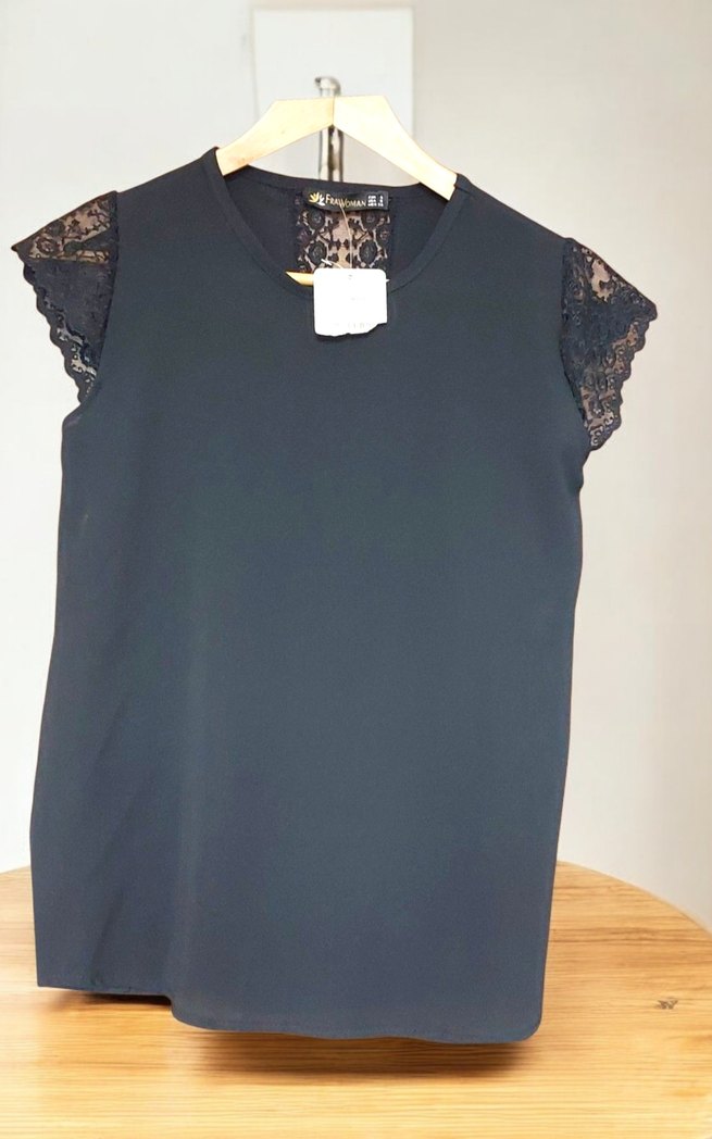Siyah kısa kollu, dantel detaylı ve yuvarlak yakalı bluz. Sentetik kumaştan, bol kesim ve normal boyda, ofis için uygundur.