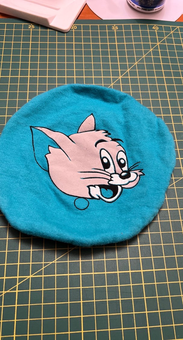 Turkuaz renkli, puf detaylı ve pastel tonlarda baskılı karikatür tom and jerry kedi yüzü desenli, karşı kültür tarzında yenidoğan bebek şapkası kıyafeti.