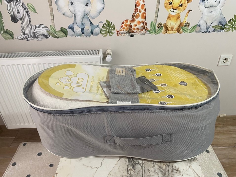 Gri renkte, baskılı desenli bebek çantası. Geniş iç hacmi ve taşıma kolaylığı sağlayan tutacağı bulunur.
