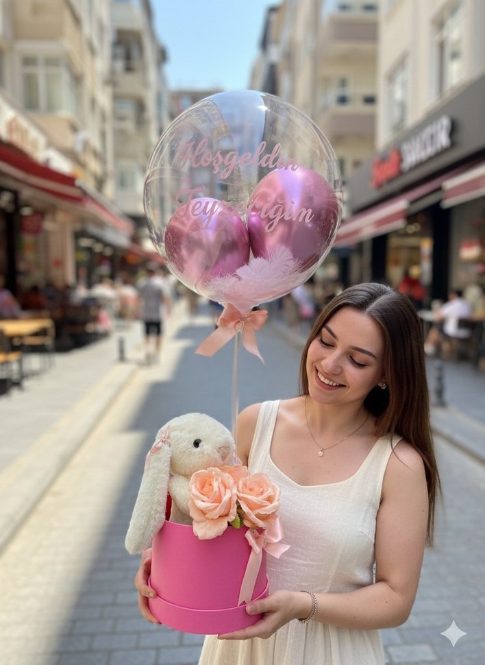 Pastel pembe peluş tavşan, yumuşak pembe güllerle yuvarlak kutuda, üstünde hoşgeldin yazılı şeffaf balon ve kalp şeklinde pembe balonlar