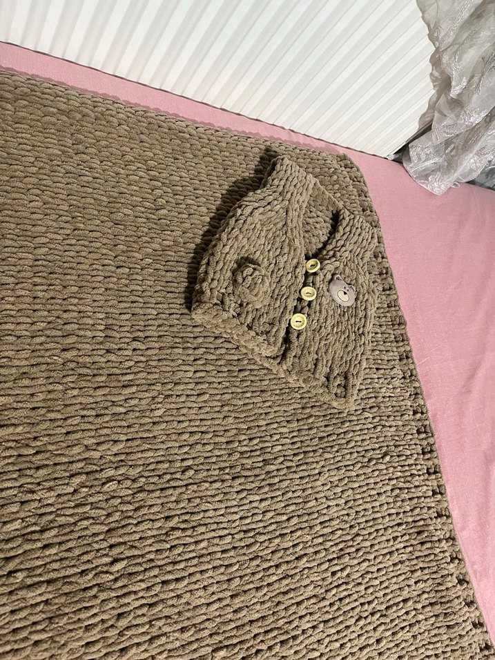 Kahverengi iplikten örülmüş, düğme ve ayıcık detaylı yeni doğan örgü yelek battaniye takım